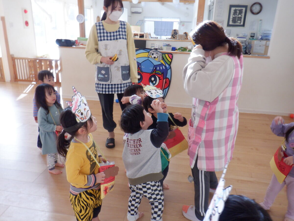 【2歳児】2月3日(火)に豆まき集会がありました。小さい組さんにはかわいいオニさんがやってきました!子どもたちは泣く子も少なく、「おにはーそと、ふくはうち!」と投げていました♪自分たちでつくったお面とバックを身につけてたのしんでいました(*^^*)
