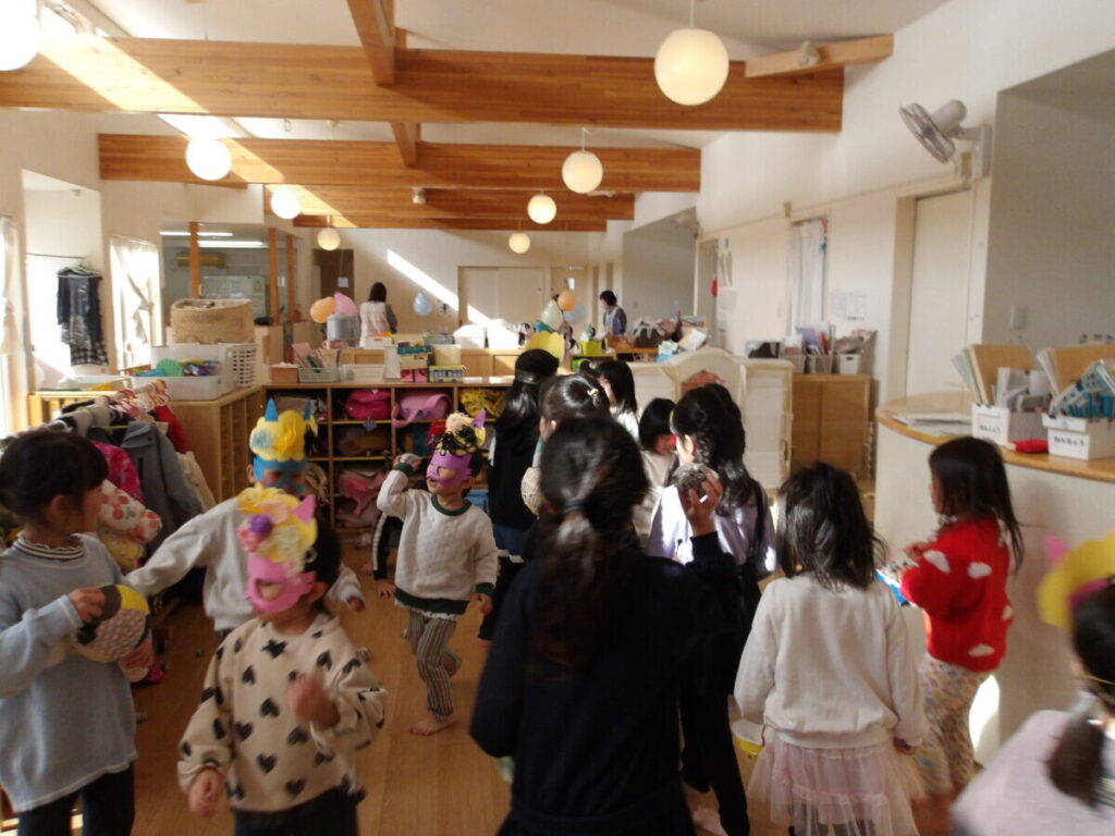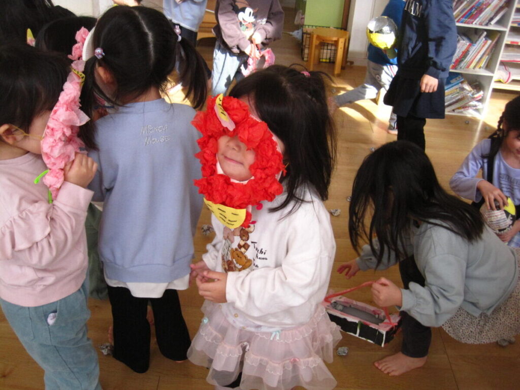 【年中】今週は豆まき集会がありました!皆で作った鬼のお面をかぶって鬼になりきり豆があたらないように逃げていましたよ(*^^*)豆をまく時はしっかり「鬼は外!福は内!」と言いながら投げて楽しんでいた年中さんでした♪