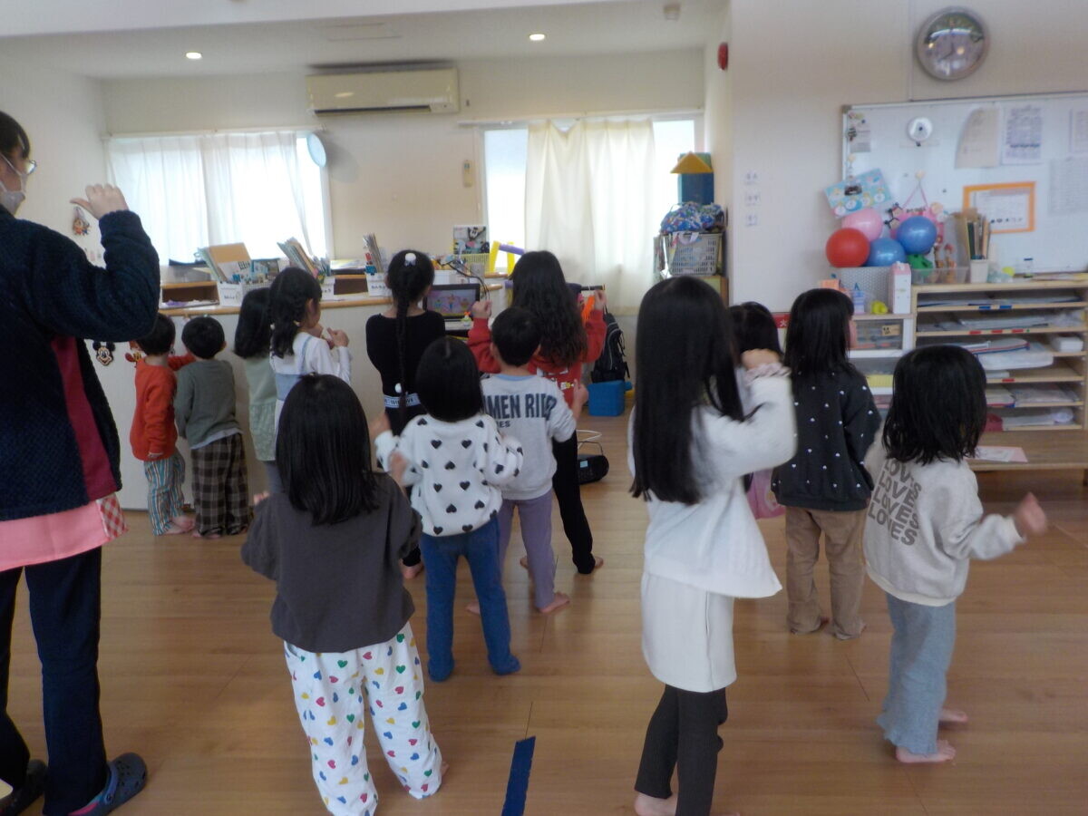 【年少】2月3日(火)に豆まき集会を行いました。「ぼくなかないよ!」「わたしおにたいじする!」とやる気満々だった子どもたち。最初に全クラス集合して節分についての話を聞いていたのですが、その時から“鬼はいつくるんだろう~”とどことなく表情が緊張していた年少さん^^;でも、大きい組さんの部屋に戻りいざ鬼が登場すると「おにはそと!ふくはうち!」と元気な掛け声のもと一生懸命に豆を投げていました。今年もみんなが元気いっぱい過ごせますように🍀