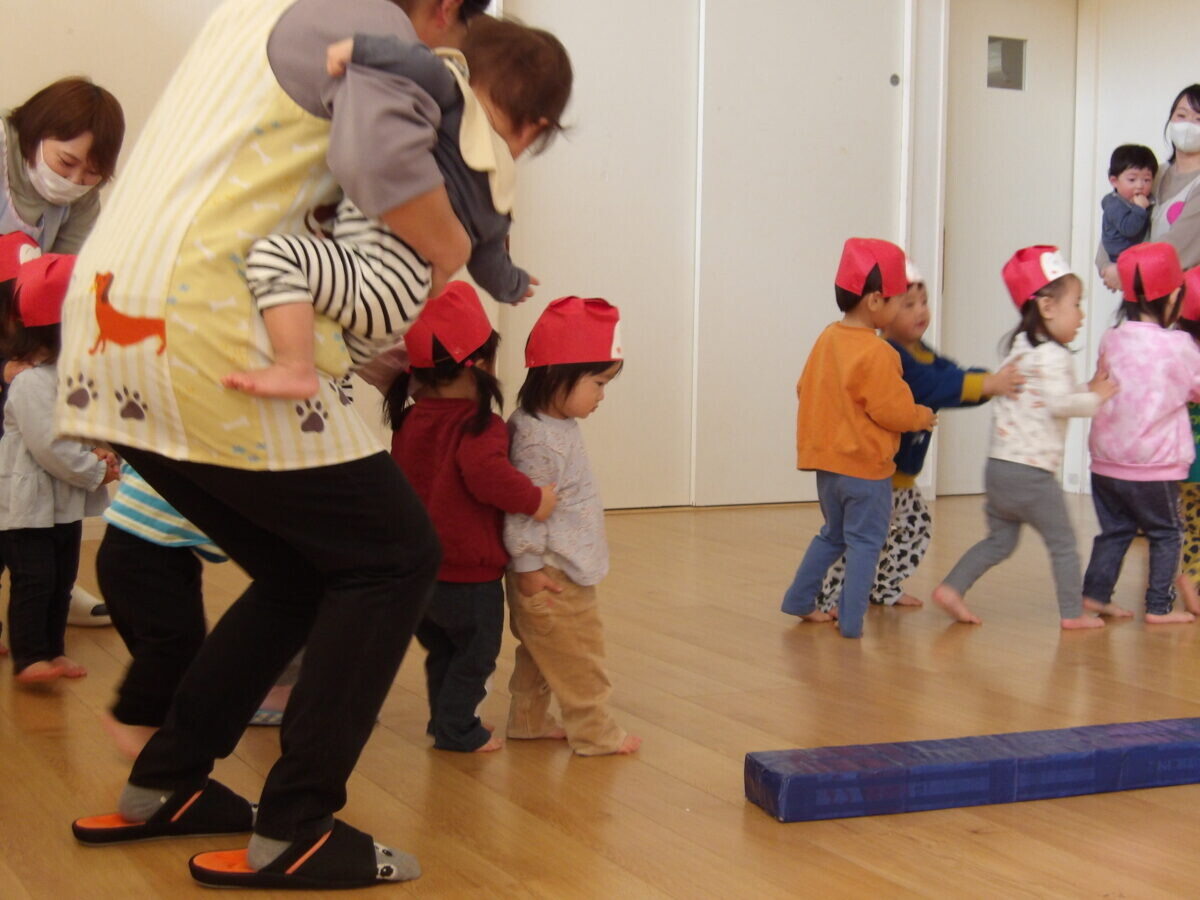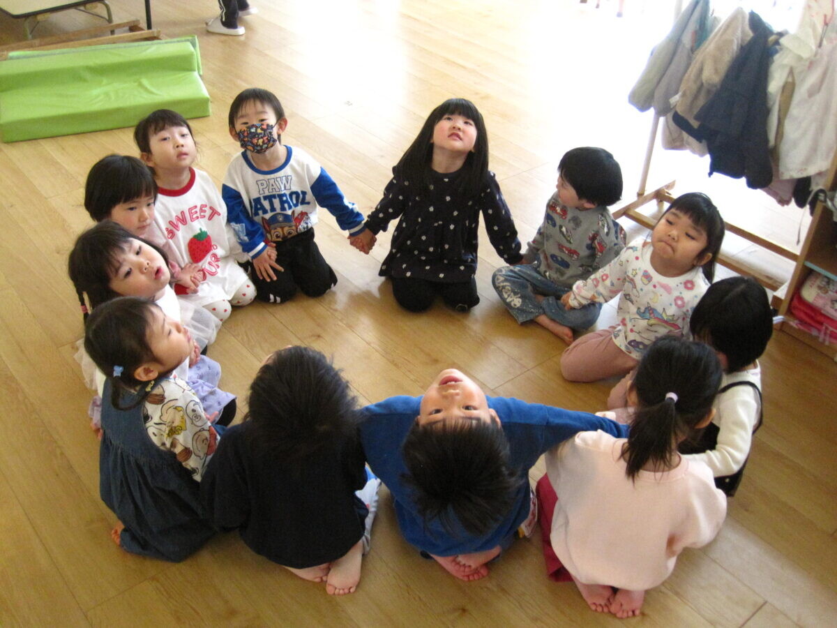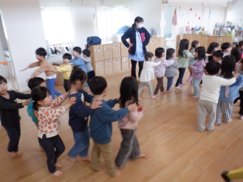年少、年中さんと一緒にジャンケン列車をしました。列車が長くなっていくと、少しずつルールが分かってきて楽しく参加する2才児さんでした(*^-^*)明日からはいよいよ大きい組さんの仲間入り!楽しみですね♪