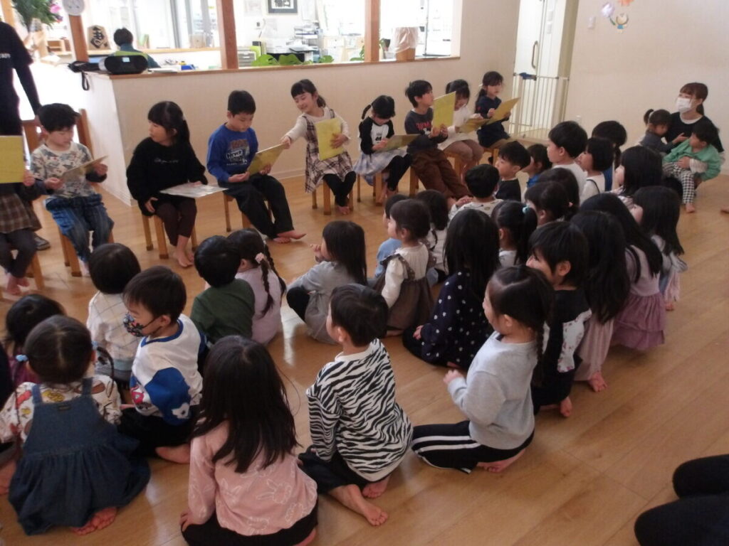 今日は、今年度最後の日。年少組での1年もみんな一人ひとりが成長して、たくましくなりました。