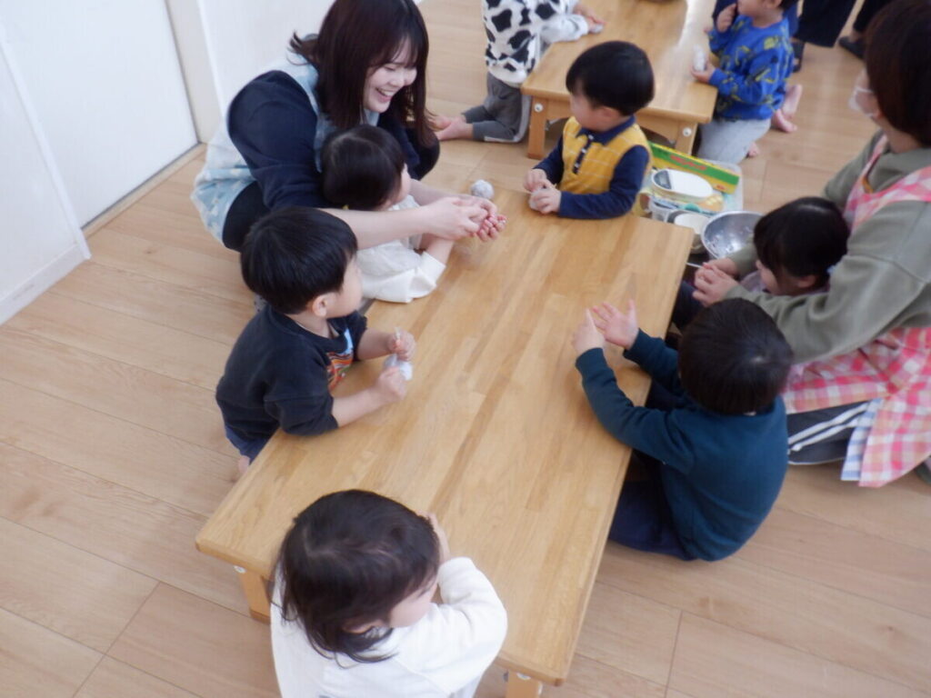 おにぎり作りをしました。普段からおにぎりの絵本を見ていたので、「サッカーボールおにぎりにする!」「ひよこおにぎりがいい!」など一人ひとりが作りたい形をイメージしながら楽しく取り組んでいました✨ぜひお家でも一緒に作ってみてください(*^^*)