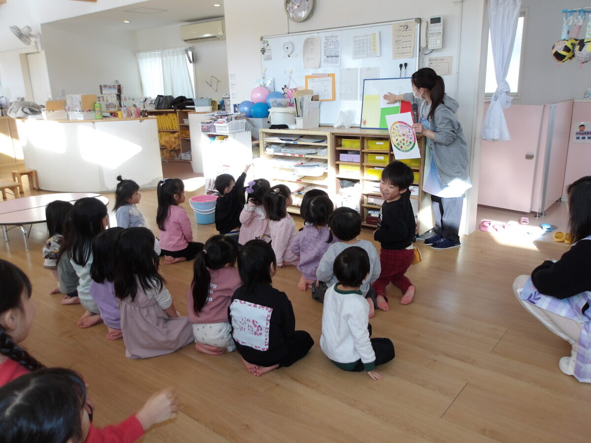 今週は食育指導がありました。三色食品群についてのクイズに「僕わかるよ!」や「答えは緑でしょ!」と得意顔でクイズに答えてしていましたよ。正解できたことをたくさん褒められて嬉しそうに笑う年中さんでした🎵