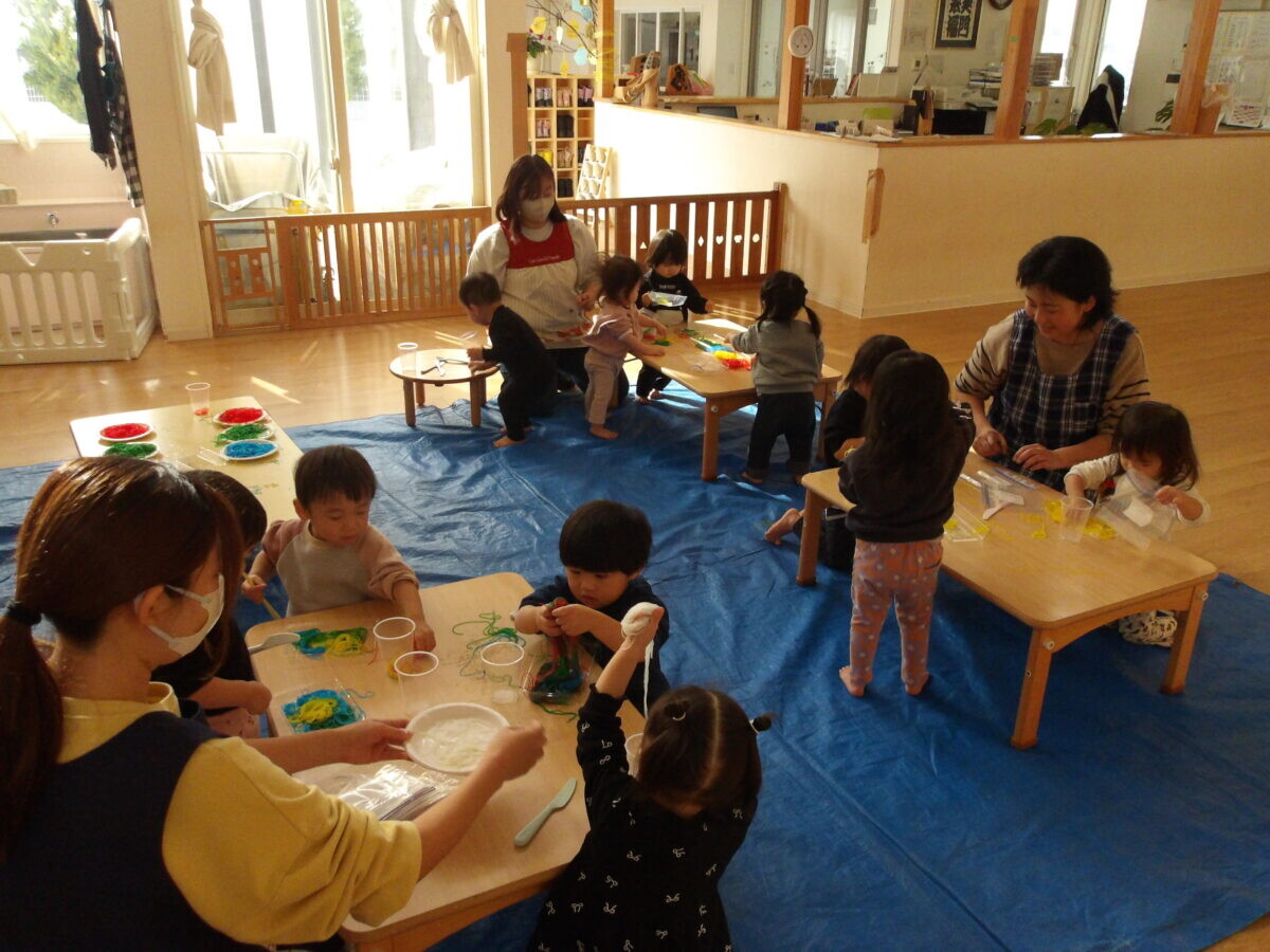 今週はダンスやサーキット遊び、雪遊び…とたくさん体を動かしました!金曜日は、0,1歳児さん一緒に春雨遊びをしました。白、赤、青、黄、緑の色がついた春雨をコップに入れてジュースにしたり、玩具の包丁で切ったり、お皿の上で混ぜたり…と、とっても楽しそうに遊んでいましたよ!また感触遊びしようね。(*^-^*)