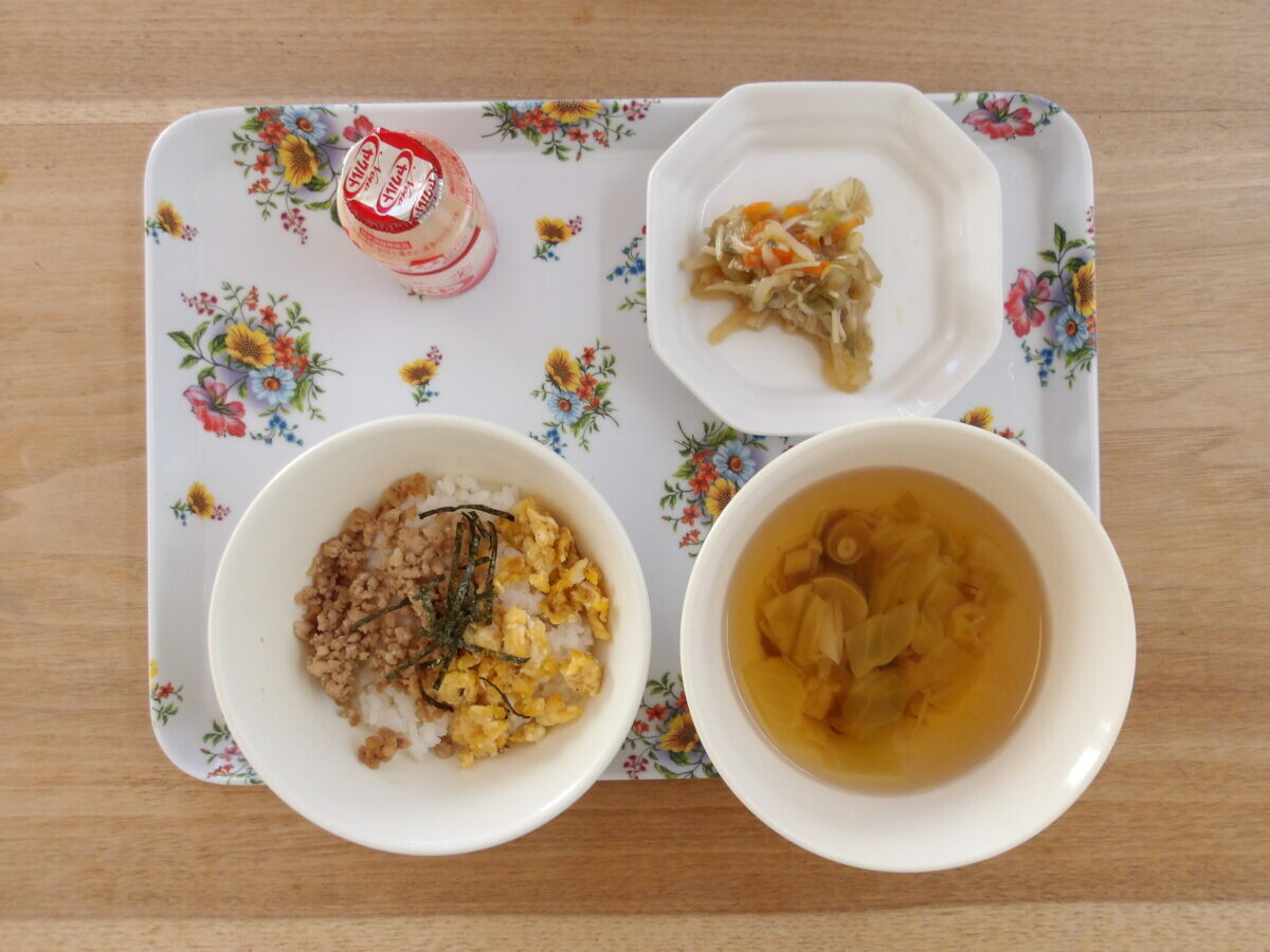 写真は、年長さんがクッキングしてくれたそぼろ丼の写真です!